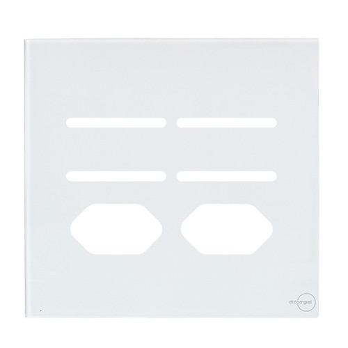 1 - PLACA P/ 4 INTERRUPTORES + TOMADA DUPLA COM SUPORTE 4X4 - DICOMPEL NOVARA GLASS BRANCO - DNGB-40000/33