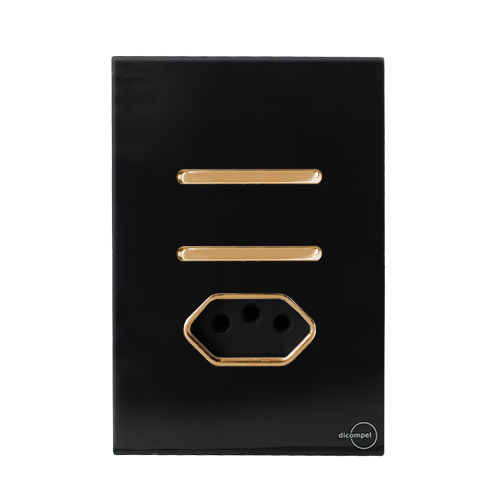 1. CJ INTERRUPTOR DUPLO SIMPLES + TOMADA 10A COM SUPORTE 4X2 - DICOMPEL NOVARA PRETO BRILHANTE GOLD - DNV1700/23PBGD
