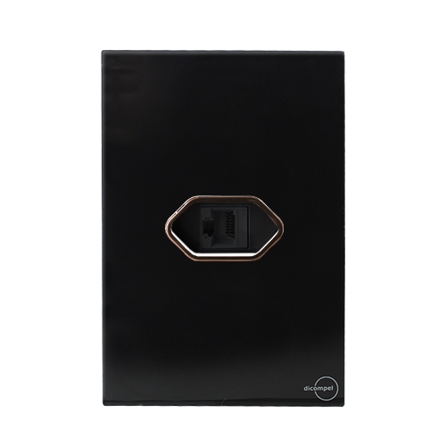 1. CJ ENTRADA RJ45 ( INTERNET ) COM SUPORTE 4X2 - DICOMPEL NOVARA PRETO BRILHANTE C/ OURO ROSE - DNV1700/41PBOR