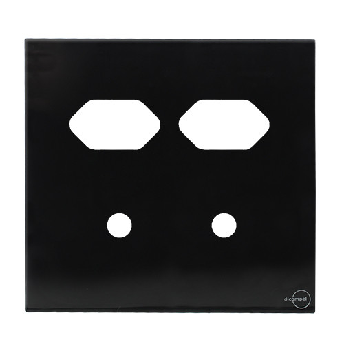 1 - PLACA P/ 2 TOMADAS + 2 FUROS COM SUPORTE 4X4 - DICOMPEL NOVARA GLASS PRETO BRILHANTE - DNGP-40000/46
