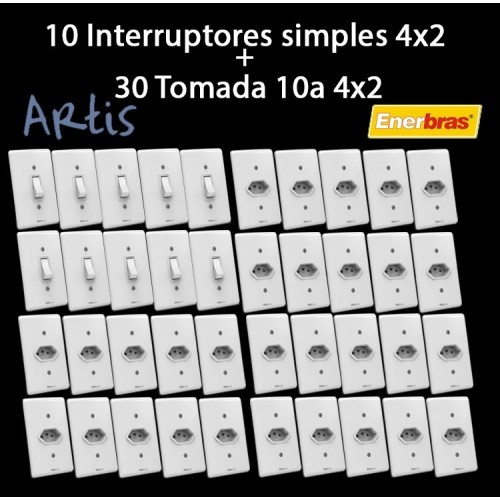 1 - KIT 10 INTERRUPTORES SIMPLES + 30 TOMADA 10A CASA COMPLETA 4X2 - ENERBRAS ARTIS BRANCO - KIT10+30EA
