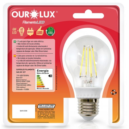 A Ourolux lança a linha SUPERLED FILAMENTO, que une a durabilidade e baixo consumo de energia elétrica à beleza da iluminação especial para lustre e abajures, em que a distribuição de luz uniforme é fundamental. Nos modelos bulbo tradicional, bolinha e vela, os produtos estão disponíveis nas temperaturas de cor 2700K e 6400K, com acabamentos claro e fosco. Todos os modelos são bivolt e ligados diretamente na rede elétrica, pois possuem drivers incorporados
